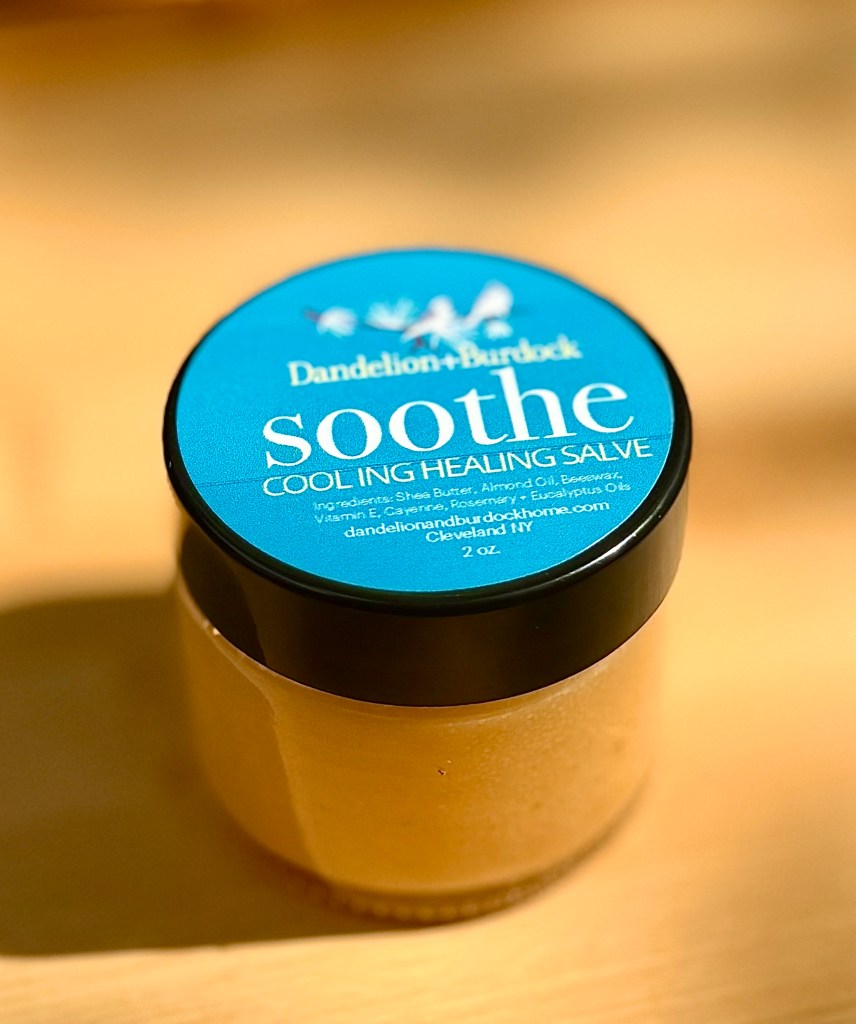 Dandelion+Burdock’s cooling healing salve, Soothe blends the anti-inflammatory and antiseptic properties of cayenne, rosemary and eucalyptus to reduce inflammation and repair skin health. 2 oz. $12